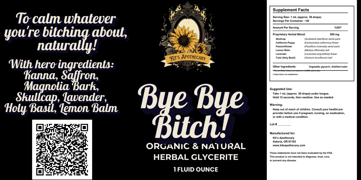 Bye Bye Bitch is your go-to when stress and irritability threaten to take over. With uplifting kanna, mood-brightening saffron, grounding adaptogens, and calming nervines, this alcohol-free glycerite helps smooth edges and restore balance — naturally sweet, gentle, and easy to take anytime.