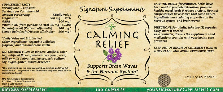 Calming Relief is a soothing, non-habit-forming formula designed to help support emotional balance, relaxation, and a sense of inner peace. Featuring a synergistic blend of Magnesium, GABA, Vitamin B6, and calming herbs like Lemon Balm and Vervain, this plant-powered supplement is perfect for daily stress support or as a natural addition to your evening wind-down ritual.