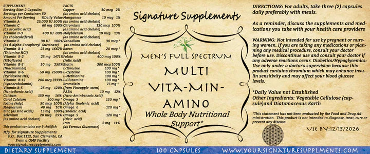 Men’s Multi Vitamin Mineral Amino is a comprehensive daily formula crafted to support energy, metabolism, immune function, and muscular health—with a nutrient profile tailored for men’s needs. This powerhouse blend features bioavailable B12 (methylcobalamin), coral calcium, omega fatty acids, and a full spectrum of amino acids and essential vitamins to keep your body operating at its peak.